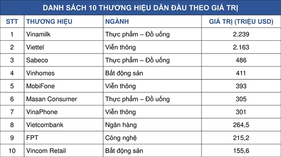 Danh sách 10 thương hiệu dẫn đầu theo giá trị. |