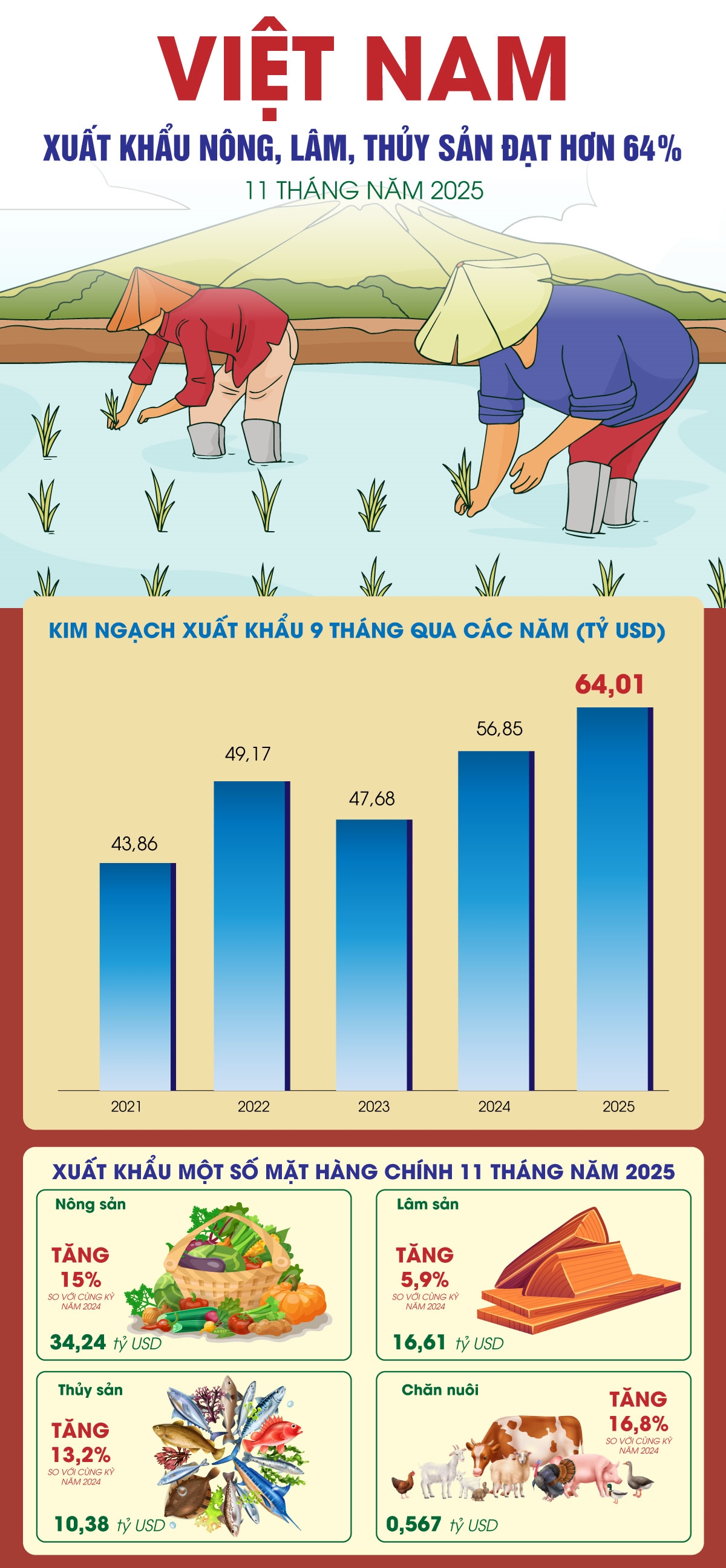 11 tháng của năm 2025, tổng kim ngạch xuất khẩu nông, lâm, thủy sản ước đạt 64,01 tỷ USD, tăng 12,6% so với cùng kỳ năm 2024, vượt con số kỷ lục của năm 2024 (62,4 tỷ USD).