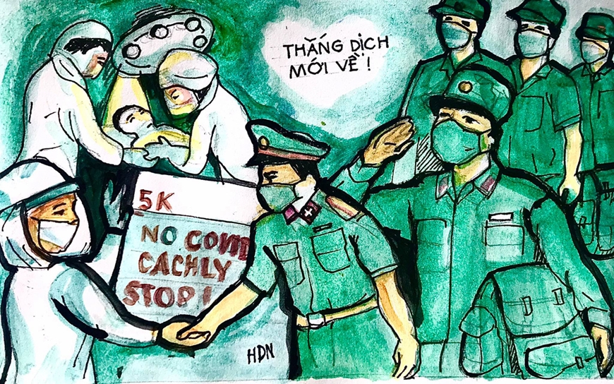 | Tranh cổ động chống đại dịch Covid-19 của nhà văn, nhà báo Huỳnh Dũng Nhân. |