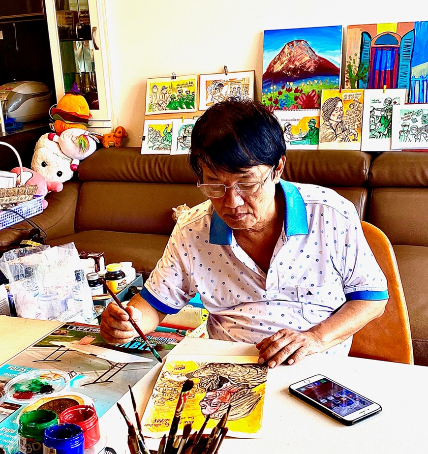 Tôi vẫn có thói quen nhắn tin hỏi thăm nhà báo Huỳnh Dũng Nhân, nhất là khi Thành phố Hồ Chí Minh nơi ông sinh sống đang căng mình chống dịch. Lần nào nhắn tin mà không thấy trả lời là tôi biết ông đang bận ngồi bên bàn vẽ, với cây cọ cùng vô số những mảng màu tươi sáng. Rồi một lúc sau, ông ấy lại gửi cho tôi một bức tranh cổ động, tuyên truyền chống dịch vừa mới hoàn thành.