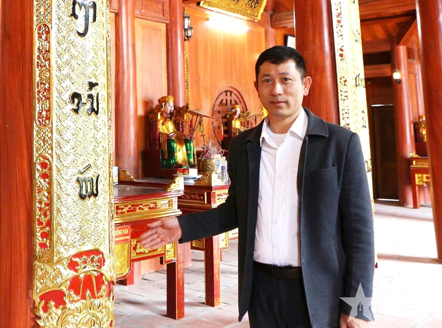 Ấn tượng với chúng tôi không chỉ là sự nhiệt tình mà là chiều sâu hiểu biết của anh. Từ lịch sử hình thành ngôi đền, cấu trúc 9 gian gắn với quan niệm vũ trụ của người Thái, đến các thành phần thờ tự, tên gọi các thần linh, các bàn thờ của 9 mường, các nghi thức trong lễ hội dâng trâu... anh đều trình bày rành mạch, hệ thống. Đặc biệt, khi dừng lại trước những dòng chữ Thái cổ còn lưu trên xà, cột, anh đọc thông thạo, giải nghĩa cặn kẽ. Trong khoảnh khắc ấy, chúng tôi hiểu rằng phía sau dáng vẻ điềm đạm của một cán bộ cơ sở là cả niềm trăn trở lớn lao với văn hóa dân tộc mình.
