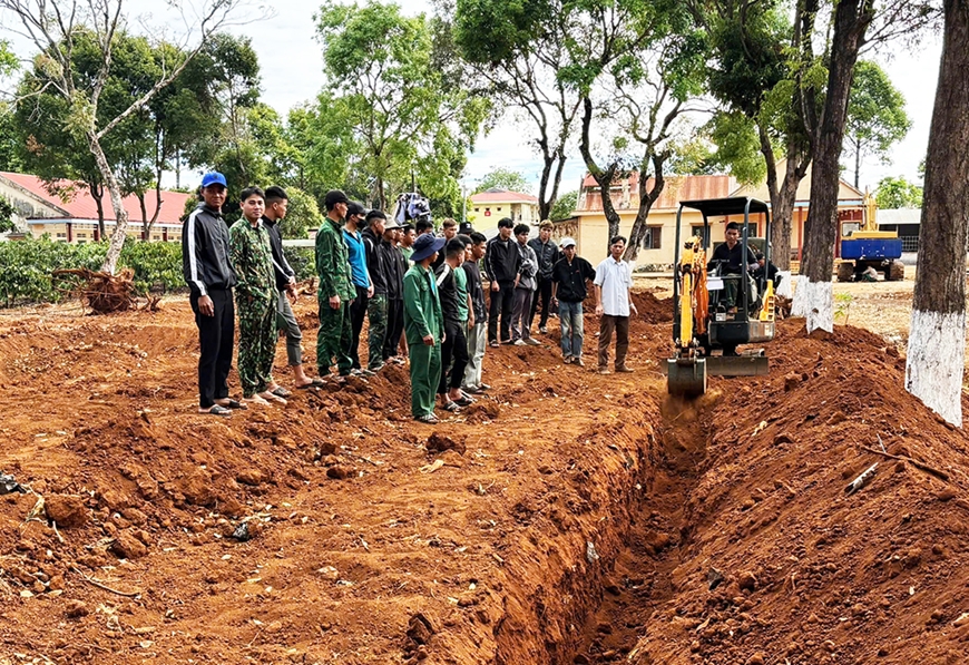 Học viên Lớp Vận hành xe - máy công trình khóa 35, Trường Cao đẳng nghề số 21 quan sát bạn học thực hành đào hào và ta luy. Ảnh: KHÁNH NGUYỄN
