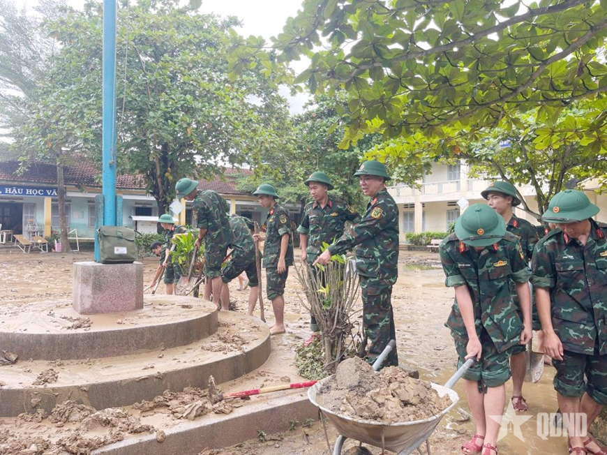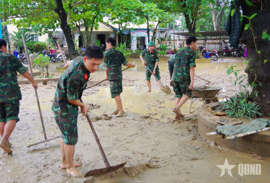| Cán bộ, học viên Trường Sĩ quan Thông Tin hỗ trợ nhân dân dọn dẹp sau lũ tại các điểm trường. |