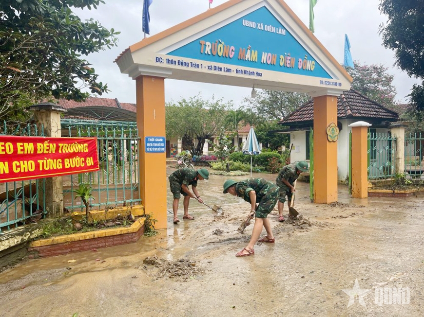 Tiếp nối nhiệm vụ hỗ trợ nhân dân khắc phục hậu quả mưa lũ trên địa bàn tỉnh Khánh Hòa, ngày 23-11, Trường Sĩ quan Thông tin tổ chức cơ động hơn 200 cán bộ, học viên đến các điểm trường thuộc hai xã Diên Lâm và Nam Khánh Vĩnh (tỉnh Khánh Hòa) để dọn dẹp và khắc phục hậu quả nặng nề của mưa lũ, giúp các cháu học sinh sớm ổn định nơi học tập.