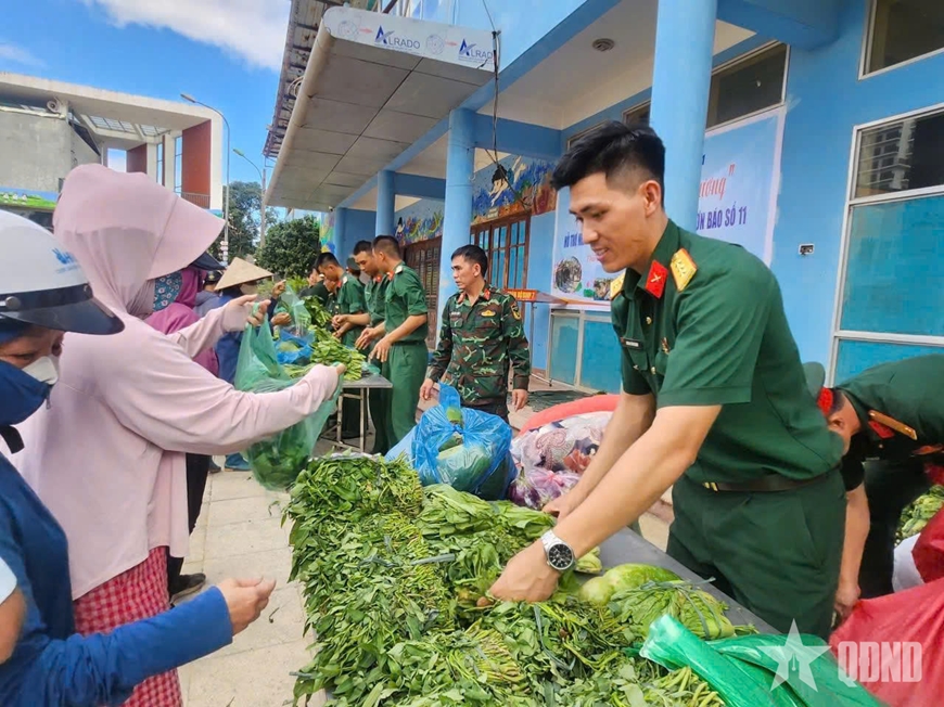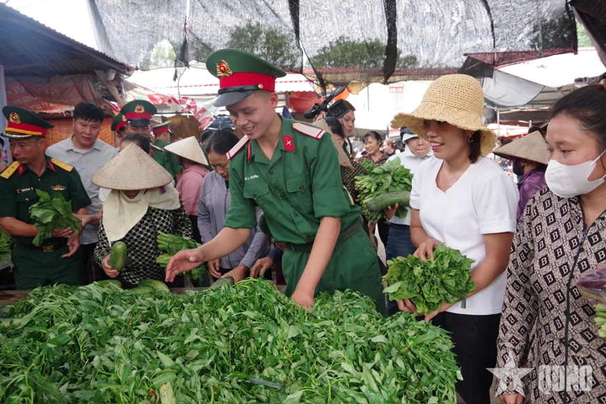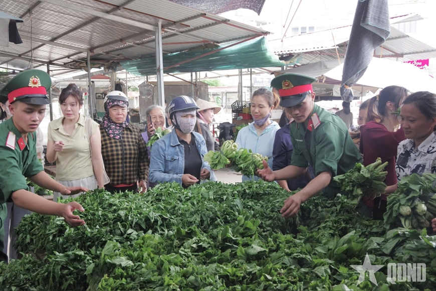Chiến sĩ Trung đoàn 141 trao tới tay nhân dân từng bó rau nghĩa tình. |