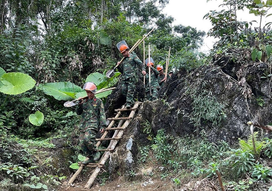| Bộ đội Công binh Lữ đoàn 543 hành quân lên khu vực rà phá bom, mìn, vật nổ. |