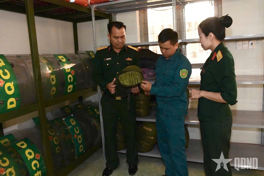 | Thượng tá Nguyễn Mạnh Toàn kiểm tra kho vật chất, trang bị SSCĐ của Trung đội dân quân thường trực. |
