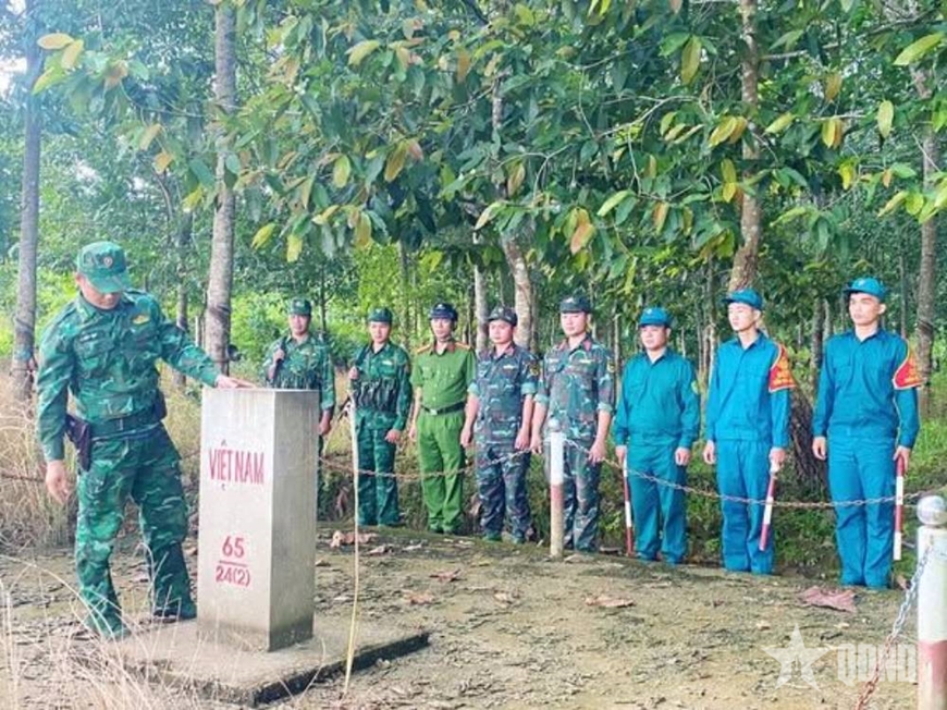 | Cán bộ, chiến sĩ Ban Tham mưu Trung đoàn 717 và lực lượng công an, Dân quân địa phương tuần tra bảo vệ cột mốc biên giới. |