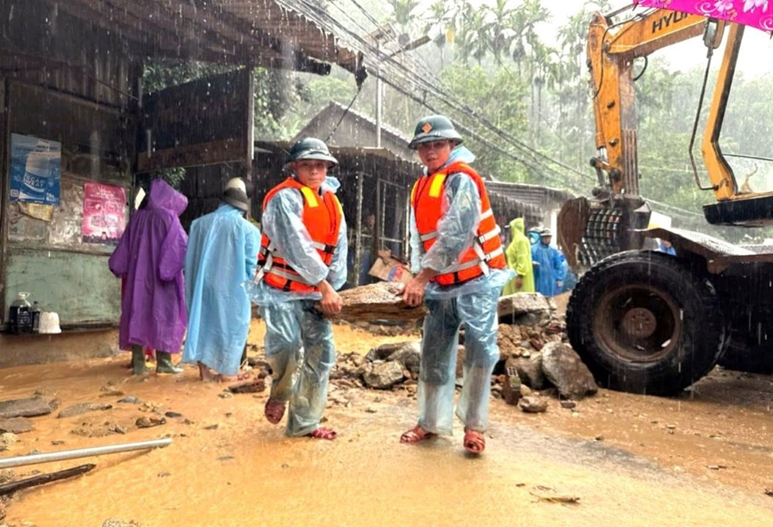 Dưới trời mưa lạnh, 30 cán bộ, chiến sĩ Ban chỉ huy Phòng thủ khu vực 3-Trà My, Ban CHQS và Công an xã Trà Tân vừa tích cực giúp các gia đình thu gom tài sản, vừa sử dụng xe ba gác, xe rùa vận chuyển bùn đất, giải phóng mặt đường. Trực tiếp chỉ huy các lực lượng tại hiện trường, Thượng tá Võ Tiến Mãnh, Phó chỉ huy trưởng Ban chỉ huy Phòng thủ khu vực 3-Trà My, cho biết: “Khối lượng đất đá sạt lở sau nhà chị Trà lên đến vài trăm khối, gây ách tắc, nguy hiểm cho người dân qua lại. Để bảo đảm an toàn, trước mắt, chúng tôi tổ chức lực lượng phân luồng, điều tiết giao thông và sử dụng gạch đá đắp đê dã chiến ngăn đất đá tràn ra đường, đồng thời tích cực nạo vét, thu gom bùn đất để giải phóng mặt đường".