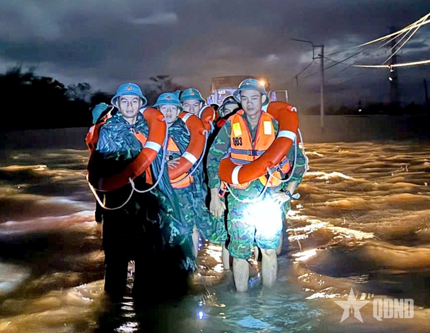 | Cán bộ, chiến sĩ, học viên Trường Quân sự Quân đoàn 34 ứng cứu nhân dân trong đêm bão số 13 đổ bộ. |