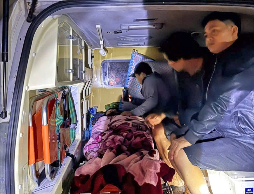 | Trường Quân sự Quân đoàn 34 đưa người dân đi cấp cứu trong đêm bão số 13 đổ bộ. |