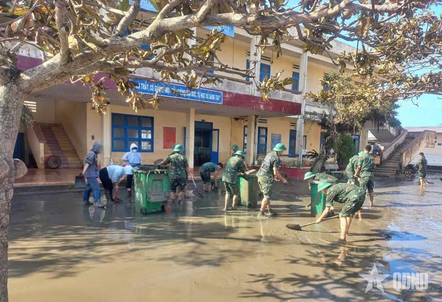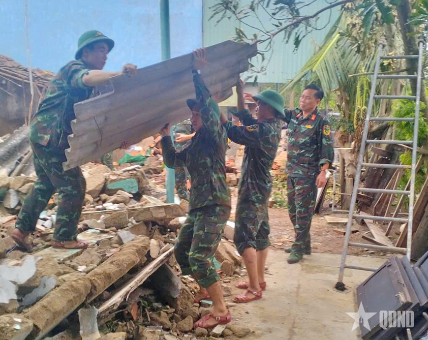 | Cán bộ, chiến sĩ, học viên Trường Quân sự Quân đoàn 34 giúp địa phương và nhân dân khắc phục hậu quả bão số 13. |