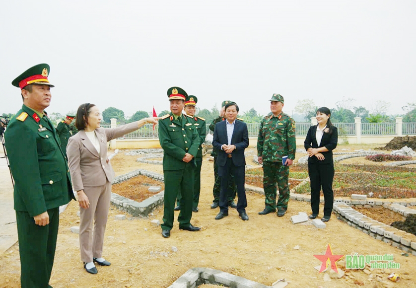 | Cán bộ, chiến sĩ Trung đoàn 48, Sư đoàn 390 giúp cải tạo khuôn viên Trường mầm non xã Hà Giang. |