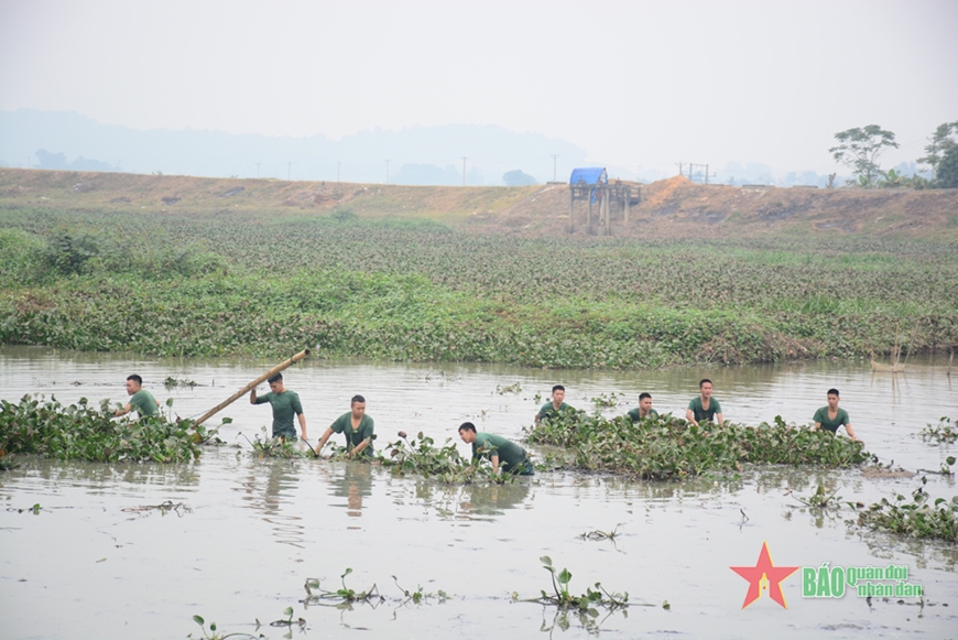Thượng úy Phạm Ngọc Tuân, Phó đại đội trưởng Đại đội trinh sát, Trung đoàn 48 chia sẻ: “Mấy ngày qua, tận dụng thời tiết nắng ấm, đơn vị tổ chức cho bộ đội tiến hành vớt bèo khai thông dòng chảy qua cầu Đìa Ngang. Vì lượng bèo lớn, cán bộ, chiến sĩ chia nhau ra từng tốp, người dùng luồng, người buộc dây, phối hợp cùng với đoàn viên, thanh niên dọn dẹp bèo, giúp khơi thông dòng chảy”.
