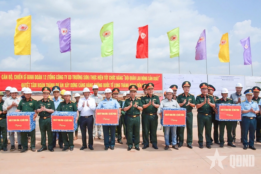 | Đại tướng Phan Văn Giang, Ủy viên Bộ Chính trị, Phó bí thư Quân ủy Trung ương, Bộ trưởng Bộ Quốc phòng tặng quà cán bộ, chiến sĩ Binh đoàn 12 và các đơn vị tại dự án Cảng hàng không quốc tế Long Thành trong chuyến công tác ngày 19-4-2025. Ảnh: ĐÌNH HUY |