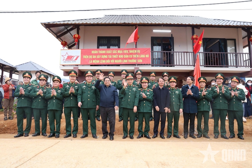 | Thủ tướng Chính phủ Phạm Minh Chính và Đại tướng Phan Văn Giang, Ủy viên Bộ Chính trị, Phó bí thư Quân ủy Trung ương, Bộ trưởng Bộ Quốc phòng cùng các đại biểu tại lễ khánh thành dự án xây dựng, tái thiết thôn Làng Nủ (tỉnh Lào Cai), ngày 22-12-2024. Ảnh: ĐÌNH HUY |