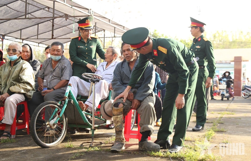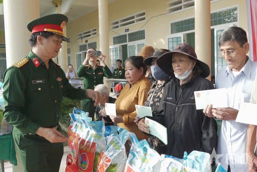 | Người dân được cán bộ, y bác sĩ Binh đoàn 15 hỗ trợ khi đến khám bệnh, nhận thuốc và quà an sinh tại chương trình |