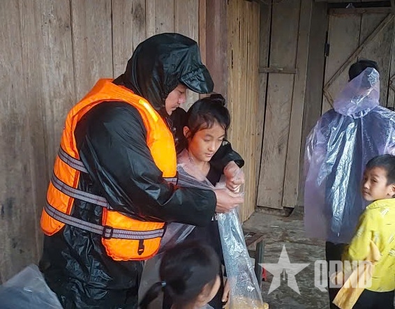 | Bộ đội hỗ trợ các em nhỏ ra khỏi vùng lũ. |
