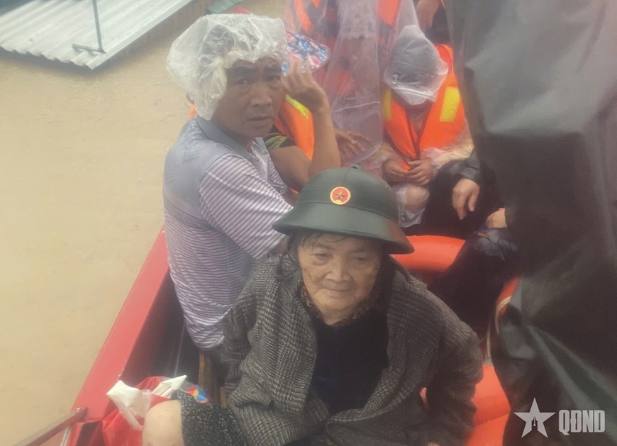| Bộ đội di dời người dân ra khỏi vùng lũ. |