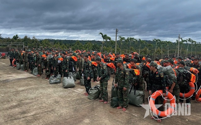 Bộ đội Trung đoàn 584, Bộ CHQS tỉnh Đắk Lắk nhận lệnh cơ động giúp dân vùng lũ.
