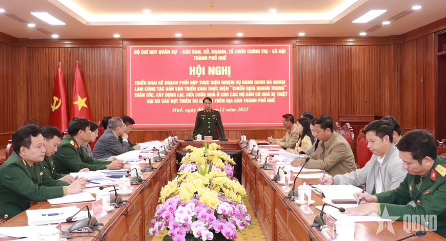 Ngày 9-12, Bộ CHQS TP Huế tổ chức hội nghị phối hợp thực hiện nhiệm vụ hành quân dã ngoại làm công tác dân vận, thực hiện “Chiến dịch Quang Trung” thần tốc xây dựng lại, sửa chữa nhà ở cho các gia đình bị thiệt hại do thiên tai.