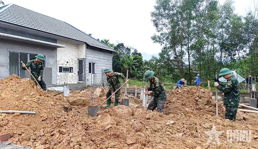 | Cán bộ, chiến sĩ Trung đoàn 6, Bộ CHQS TP Huế tham gia xây dựng nhà ở xã Khe Tre. |