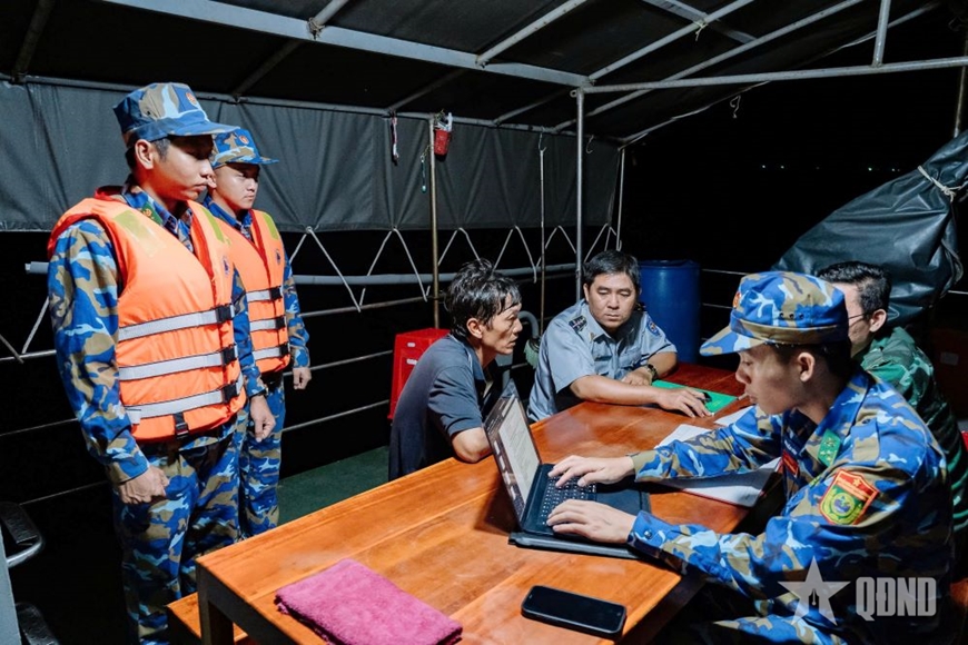 Ngay trong ngày đầu ra quân, phối hợp với lực lượng Kiểm ngư tỉnh và Đồn Biên phòng Tiên Hải, Tổ tuần tra đã tiến hành kiểm tra các phương tiện đang hoạt động khai thác quanh khu vực quần đảo Hà Tiên. Từng con tàu cá được tiếp cận, từng bộ hồ sơ được đối chiếu, từng thiết bị giám sát hành trình (VMS) được kiểm tra tín hiệu. Trong ánh đèn pin loang loáng trên boong tàu, cán bộ biên phòng kiên trì giải thích cho ngư dân về vùng biển được phép khai thác, trách nhiệm duy trì VMS 24/24 giờ và những hậu quả pháp lý nếu vi phạm.