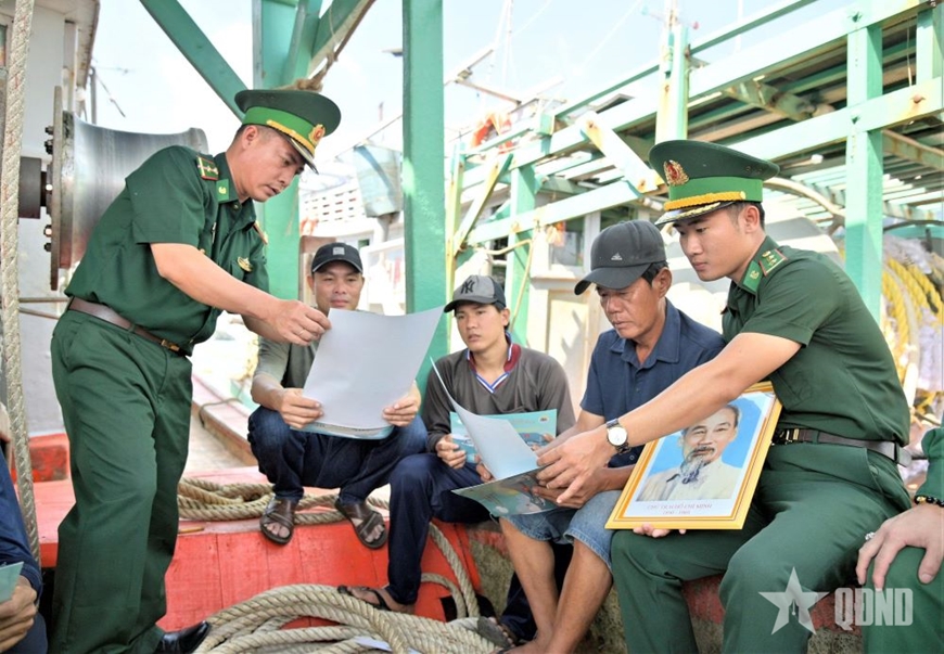 Từ nhận thức đó, công tác tuyên truyền không chỉ được thực hiện trong hội trường mà còn được đưa thẳng xuống tàu, ra tận bến cá. Cán bộ biên phòng trực tiếp gặp gỡ, trao đổi với từng chủ phương tiện, từng thuyền viên; linh hoạt vận dụng nhiều hình thức phù hợp với từng địa bàn, từng nhóm đối tượng. Nội dung tuyên truyền tập trung vào các quy định cốt lõi về chống khai thác IUU, như vùng biển được phép khai thác, việc lắp đặt và duy trì thiết bị giám sát hành trình, thủ tục xuất, nhập bến, trách nhiệm pháp lý khi vi phạm; đồng thời gắn với giáo dục ý thức bảo vệ chủ quyền biển, đảo, giữ gìn hình ảnh và uy tín quốc gia. Từ đầu năm đến nay, gần 9.800 lượt cán bộ, chiến sĩ BĐBP tỉnh đã tham gia hơn 7.400 lượt tuyên truyền, phát hàng chục nghìn tờ rơi, tài liệu pháp luật, trao tặng cờ Tổ quốc, ảnh Bác Hồ và nhiều phần quà thiết thực cho ngư dân.