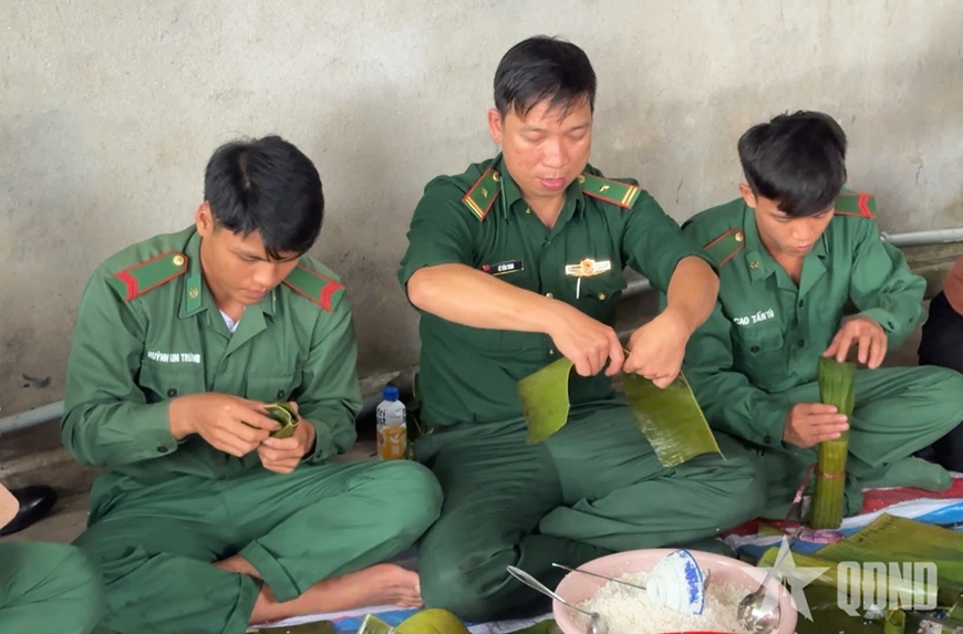 Cán bộ, chiến sĩ Đồn Biên phòng Đức Minh gói bánh chưng, bánh tét gửi tặng đồng bào vùng lũ.