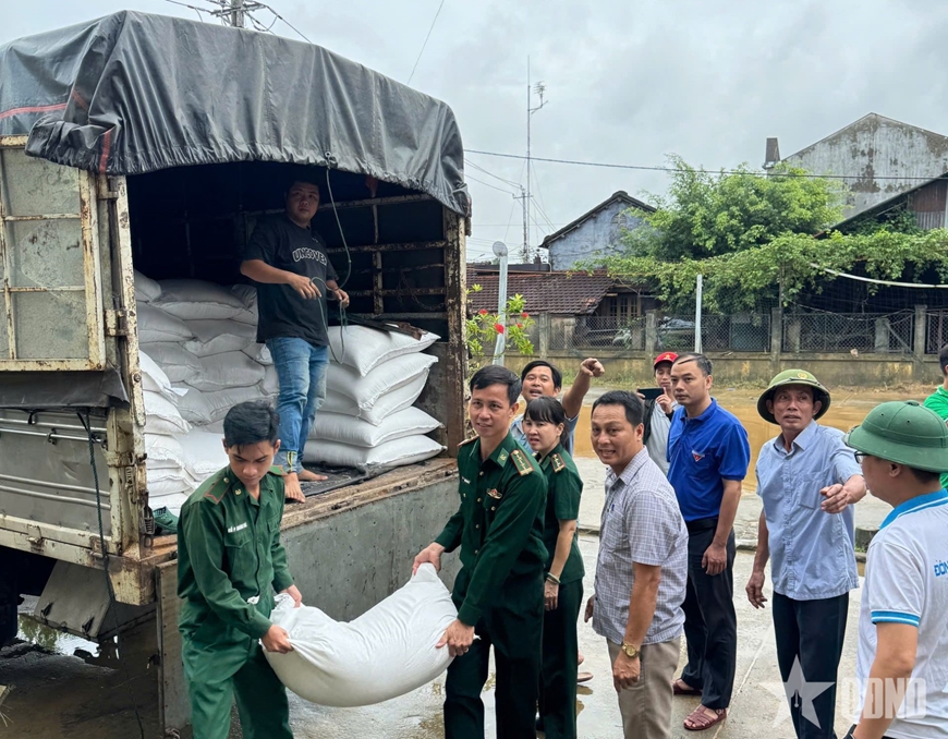 Cán bộ, chiến sĩ Ban chỉ huy Biên phòng cửa khẩu cảng Đà Nẵng vận chuyển gạo hỗ trợ nhân dân các thôn thuộc xã Thu Bồn, TP Đà Nẵng.