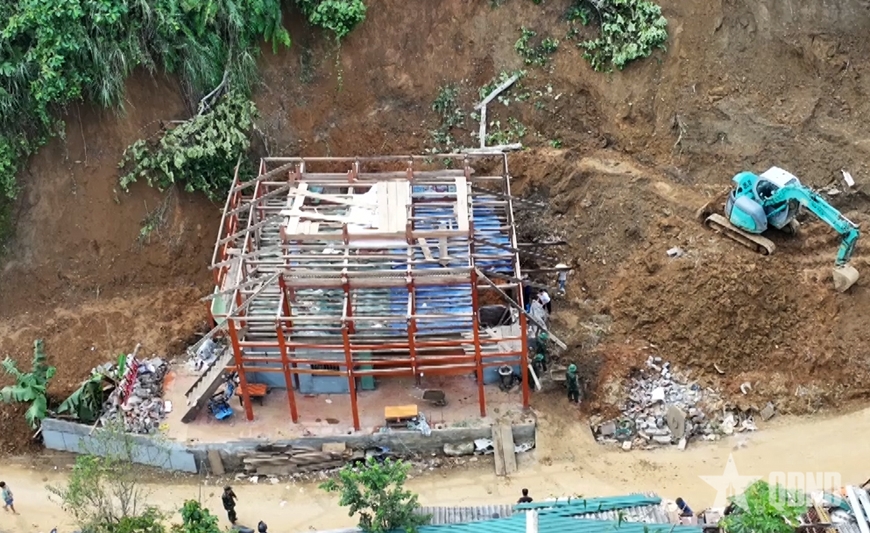 Bộ đội hỗ trợ người dân tháo dỡ nhà bị đất đá sạt lở tại thôn Nặm Sai, xã Cao Minh, tỉnh Thái Nguyên. |