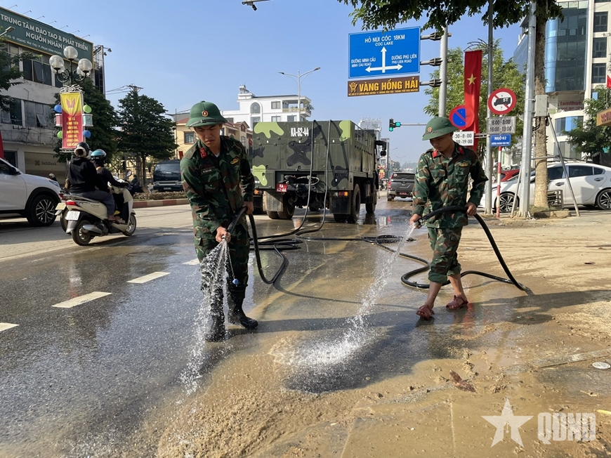 Cán bộ, chiến sĩ Tiểu đoàn Phòng hóa 23 (Bộ Tham mưu Quân khu 1) rửa bùn đất trên đường Hoàng Văn Thụ, phường Phan Đình Phùng, tỉnh Thái Nguyên. Ảnh: VĂN HIẾU |