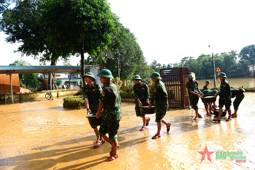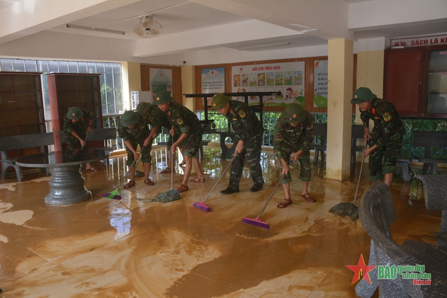 Tại Nhà văn hóa cộng đồng thôn Trung Tiến, 30 cán bộ, chiến sĩ thuộc Trung đoàn 841, Bộ CHQS tỉnh đang khiêng bàn ghế, dọn vệ sinh, lau chùi các vật dụng dùng chung cộng đồng… Lúc này trời đã bắt đầu nắng, cái nắng sau lũ rất gay gắt. Trên đầu nắng đốt, dưới chân bùn sâu, dẻo quẹo, song từng tốp, từng cặp chiến sĩ thoăn thoắt khiêng nước lau nhà; khiêng bàn, ghế vệ sinh và vất vả nhất là dọn lớp bùn dẻo, dày cả chục cm.