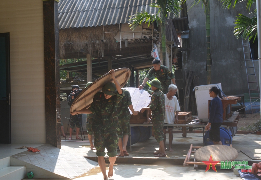 | Cán bộ, chiến sĩ Trung đoàn 841 giúp gia đình ông Trần Xuân Khương sắp xếp đồ sinh hoạt. |