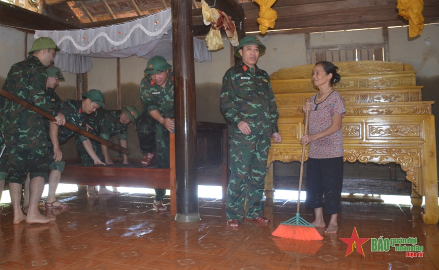 | Cán bộ, chiến sĩ Trung đoàn 841 giúp gia đình thương binh Nguyễn Duy Hùng, thôn Trung Tiến, xã Điền Mỹ dọn vệ sinh sau lũ. |