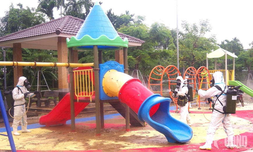 Phun khử khuẩn tại công viên Nguyễn Văn Trỗi (phường Điện Bàn).