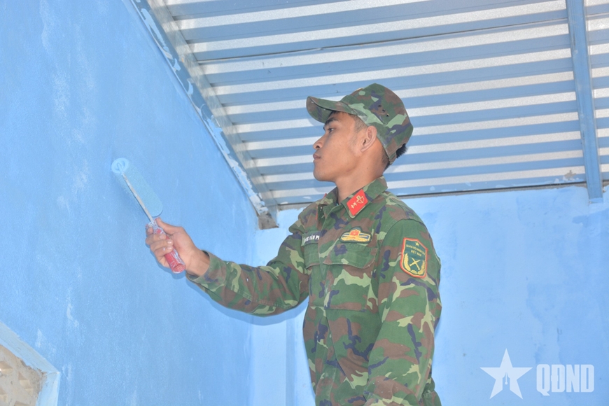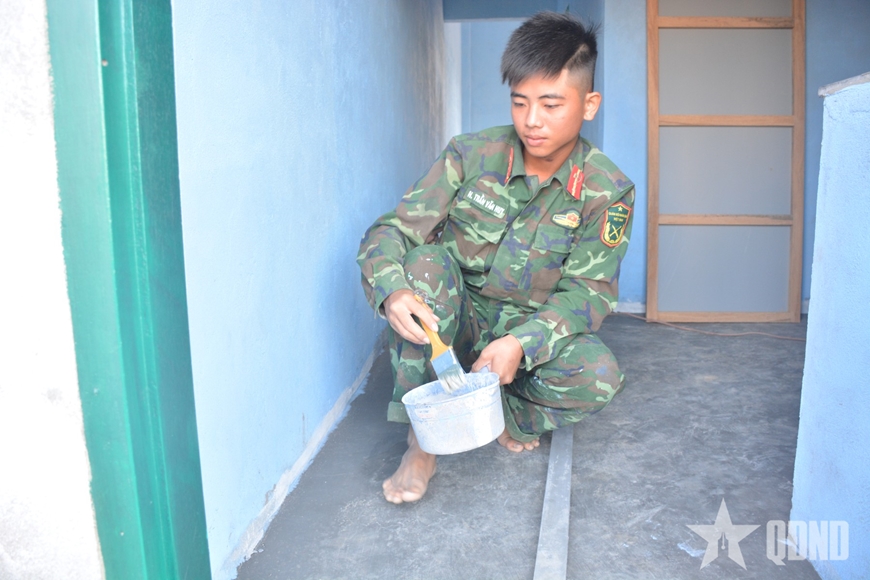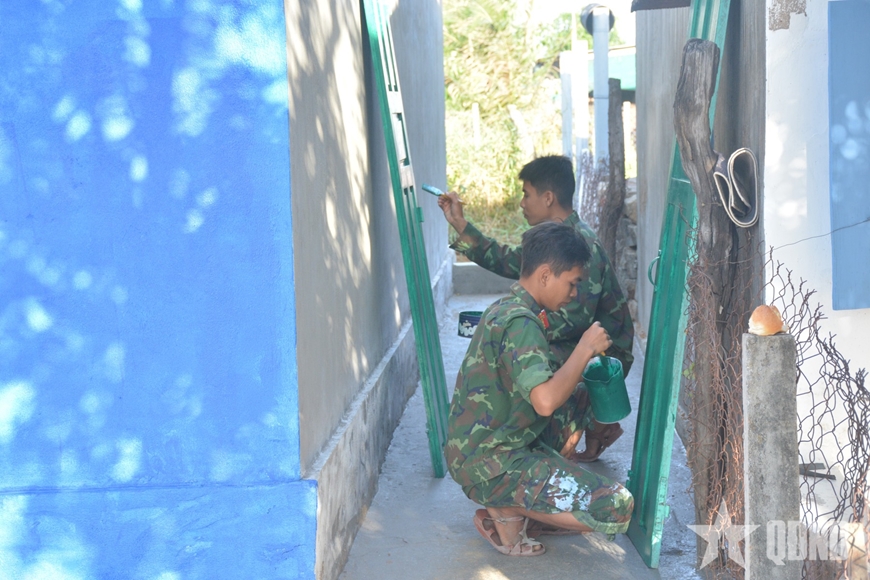 | Các chiến sĩ tiến hành sơn cửa nhà. |