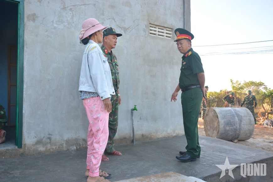 | Thượng tá Nguyễn Văn Hoan, Phó chính ủy Lữ đoàn Đặc công nước 5 (bên phải) kiểm tra tiến độ xây dựng tại nhà bà Lê Thị Dung, thôn 3, xã Xuân Hải. |