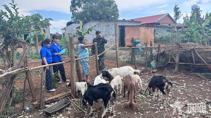 | Trí thức trẻ tình nguyện Đoàn KT-QP Quảng Sơn hướng dẫn hộ K’ Ang ở bon Sa Na (Quảng Sơn, Lâm Đồng) chăm sóc đàn dê. |
