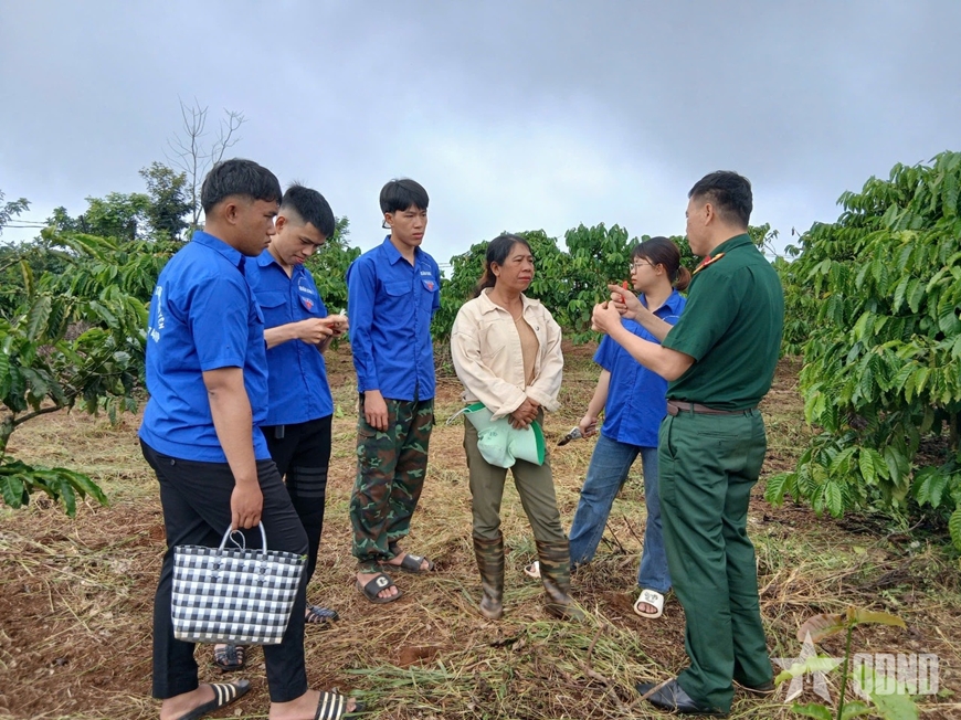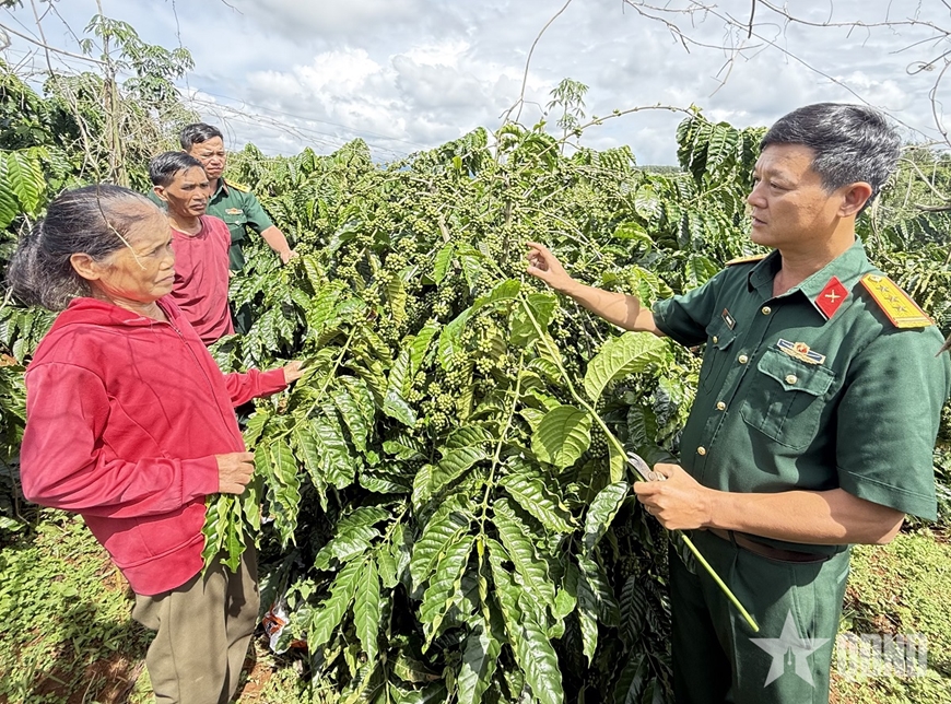 | Bộ đội Đoàn KT-QP Quảng Sơn hướng dẫn hộ bà Nguyễn Thị Nẩy ở bon Rbút (Quảng Sơn, Lâm Đồng) kỹ thuật tỉa cành vườn cà phê cưa ghép. |
