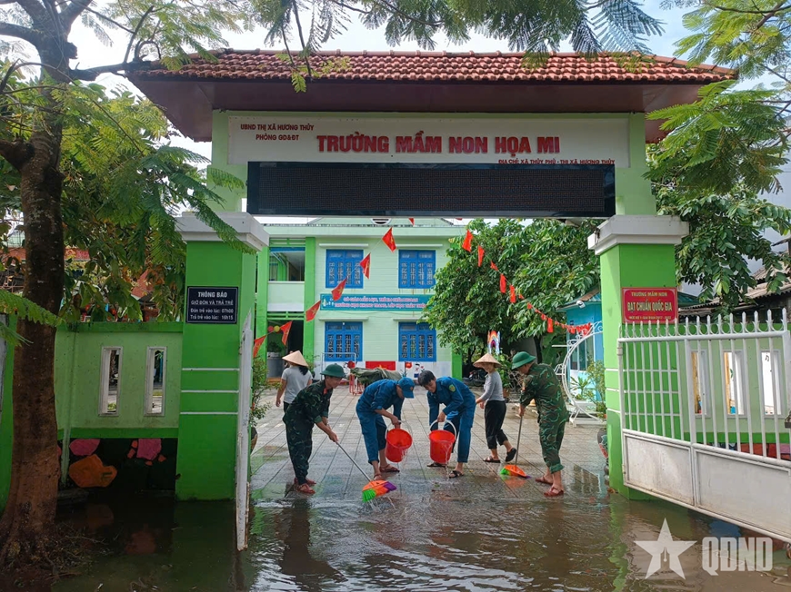 | Cán bộ, chiến sĩ Trung đoàn Bộ binh 6 (Bộ CHQS thành phố Huế) giúp đỡ Trường Mầm non Thủy Thanh 1 (cơ sở Vân Thê Đập) khắc phục hậu quả mưa lũ. |