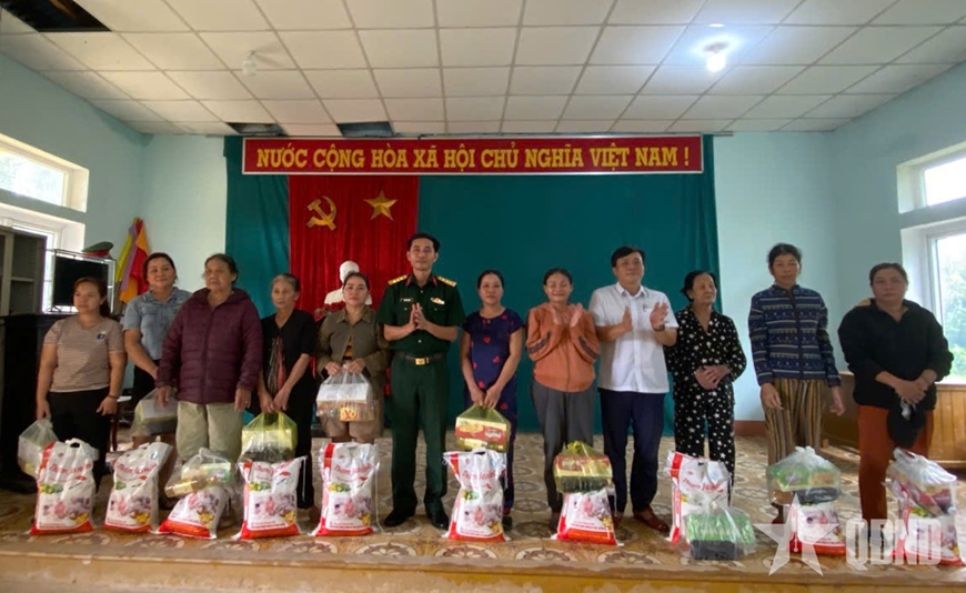 | Thượng tá Đào Ngọc Thành, Chính ủy Ban Chỉ huy phòng thủ khu vực 3 – Phú Lộc trao quà tặng các gia đình bị ảnh hưởng do mưa lũ.  |