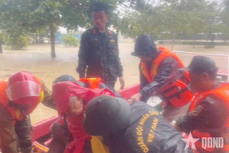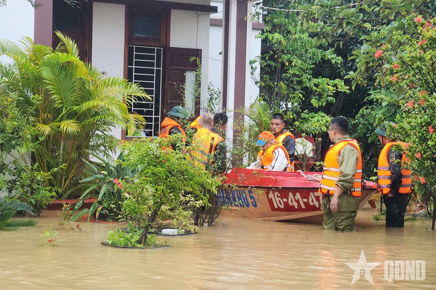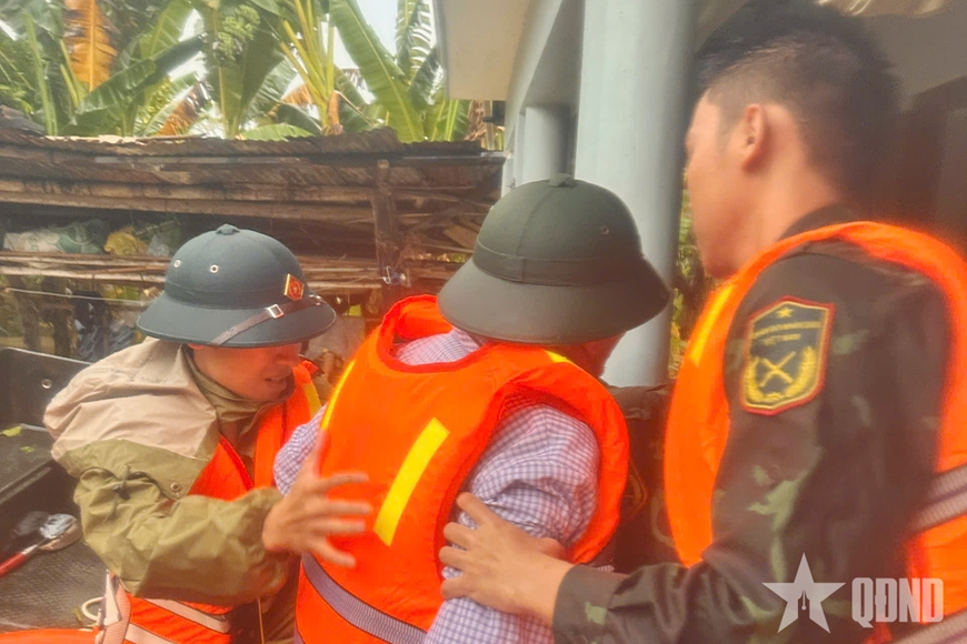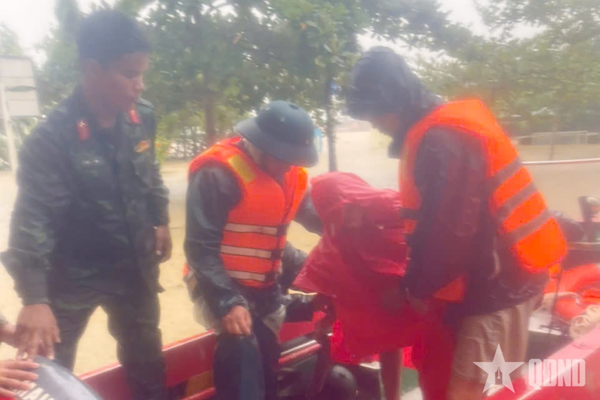 | Bộ đội bế người dân thôn Đông Môn 1, xã Diên Điền, đến nơi an toàn. |
