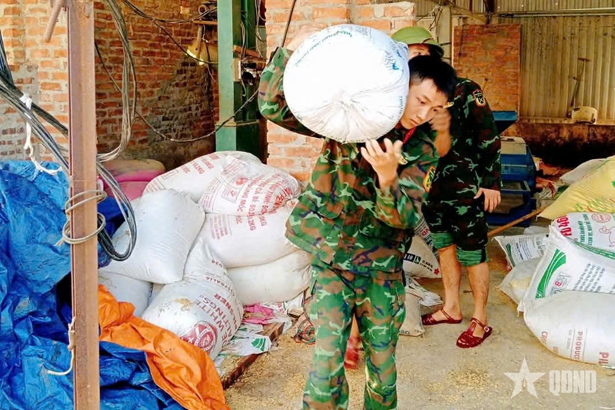 Bộ đội hỗ trợ nhân dân xã Bình Nguyên di chuyển tài sản đến nơi an toàn. |