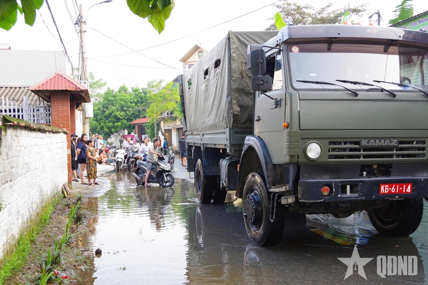 Xe chở cán bộ, chiến sĩ Sư đoàn 304 (Quân khu 2) hành quân đến thôn Hữu Bằng, xã Bình Nguyên, tỉnh Phú Thọ hỗ trợ nhân dân khắc phục hậu quả ngập lụt. |