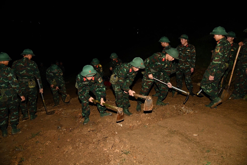 Ban ngày, đất đá được san gạt, cây cỏ được phát quang. Ban đêm, ánh đèn pin loang loáng soi từng nhát cuốc, từng xe đá được rải xuống lối lên xuống bến. Riêng đêm 15-2, hàng trăm cán bộ, chiến sĩ gần như trắng đêm, phối hợp cùng Lữ đoàn Công binh 249 rải đá hàng trăm mét đường dốc. Chứng kiến không khí làm việc hối hả, khẩn trương của bộ đội trong bóng tối và bùn đất, bất chợt tôi không khỏi xúc động khi nhận ra màu áo của các anh dường như đã hòa vào nhau. Quả thật, nếu không có quân hàm trên ve áo, nhiều người khó có thể phân biệt đâu là cán bộ, đâu là chiến sĩ.