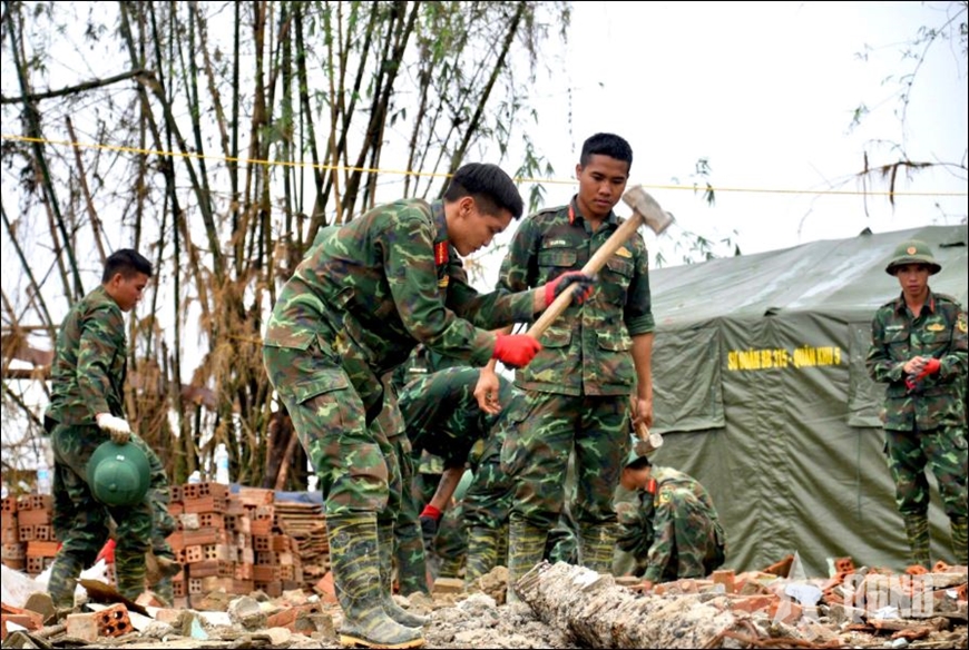 Cách đó không xa, cán bộ, chiến sĩ Đội xây dựng số 1, Cục Hậu cần-Kỹ thuật Quân khu 5 khẩn trương xây nhà cho gia đình bà Trần Thị Duyệt. Đội được chia thành các tổ công việc cụ thể như cắt sắt, ghép khung nền móng, đóng cốp pha, trộn bê tông. Mỗi người một việc, phối hợp nhịp nhàng, thao tác thuần thục. Đi đến đâu cũng thấy nhịp lao động hối hả, khẩn trương. Tất cả đều chung một tinh thần, việc giúp dân là trên hết.