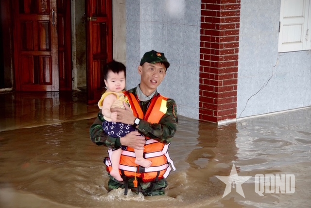 | Thượng sĩ Phạm Ngọc Lực, chiến sĩ Trung đoàn 584 (Bộ CHQS tỉnh Đắk Lắk) cứu cháu bé xã Hòa Thịnh thoát khỏi lũ dữ. |