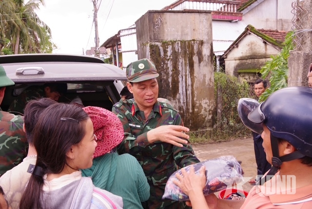 | Bộ đội tỉnh Đắk Lắk trao quà cứu trợ tới bà con vùng lũ Hòa Thịnh. |