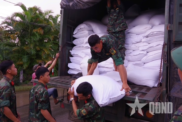 | Bộ đội tỉnh Đắk Lắk vận chuyển lương thực hỗ trợ bà con vùng lũ Hòa Thịnh. |